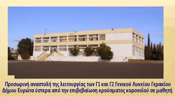 Σας ενημερώνουμε ότι, ύστερα από την επιβεβαίωση κρούσματος κορωνοϊού SARS – CοV – 2 (COVID-19) στο ΓΕΛ Γερακίου, αποφασίστηκε η προσωρινή αναστολή της λειτουργίας των τμημάτων Γ1 και Γ2 Γενικού Λυκείου Γερακίου του Δήμου Ευρώτα της Περιφερειακής Ενότητας Λακωνίας από 4-11-2020 έως και 17-11-2020.