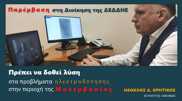 Νεοκλής Κρητικός: Παρέμβαση στη Διοίκηση της ΔΕΔΔΗΕ για τη Μονεμβασία
