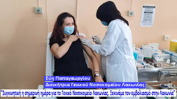 Συμβολικά εμβολιάστηκε πρώτη η Διοικήτρια του Γενικού Νοσοκομείου Λακωνίας κ. Εύη Παπαγεωργίου (βλέπε φωτο), η οποία στο μήνυμά της για την σημερινή ημέρα ανέφερε : "Συγκινητική η σημερινή ημέρα για το Γενικό Νοσοκομείο Λακωνίας.