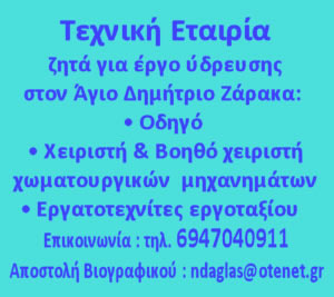 Από Τεχνική Εταιρία ζητούνται για εργασία σε έργο ύδρευσης στην περιοχή Αγίου Δημητρίου-Ζάρακα, οι παρακάτω ειδικότητες: