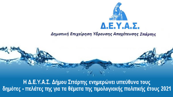 Η Δ.Ε.Υ.Α.Σ. Δήμου Σπάρτης ενημερώνει υπεύθυνα τους δημότες - πελάτες της για τα θέματα της τιμολογιακής πολιτικής έτους 2021.