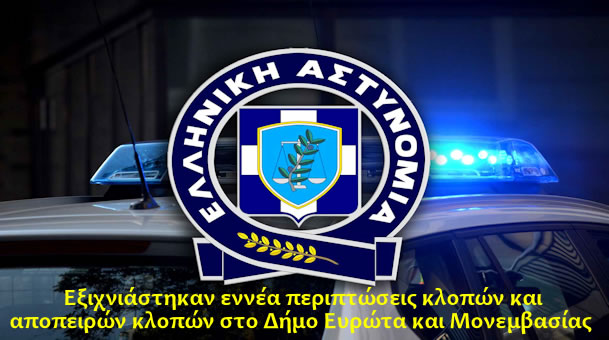 Εξιχνιάστηκαν, ύστερα από μεθοδική έρευνα του Τμήματος Ασφάλειας Σπάρτης, σε συνεργασία με το Αστυνομικό Τμήμα Ευρώτα, εννέα (9) περιπτώσεις κλοπών και αποπειρών κλοπών σε τοπικές κοινότητες των Δήμων Ευρώτα και Μονεμβασίας.