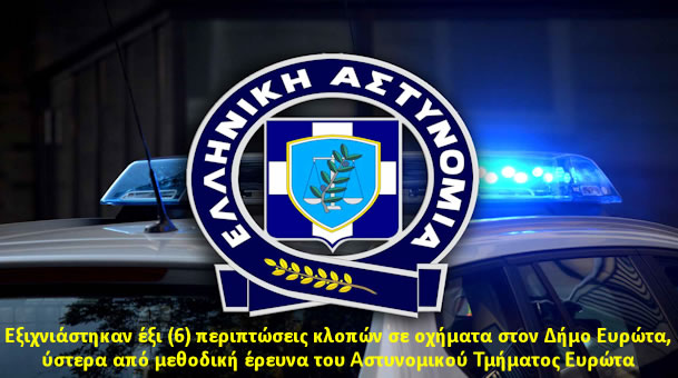 Εξιχνιάστηκαν έξι (6) περιπτώσεις κλοπών σε οχήματα σε τοπικές κοινότητες του Δήμου Ευρώτα, ύστερα από μεθοδική έρευνα του Αστυνομικού Τμήματος Ευρώτα