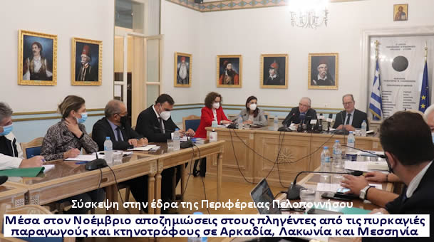 Αυτά γνωστοποιήθηκαν κατά τη σύσκεψη που έλαβε χώρα στην έδρα της Περιφέρειας, στην Τρίπολη, την Παρασκευή 8 Οκτωβρίου 2021, στις 12 το μεσημέρι, με τη συμμετοχή του περιφερειάρχη Παναγιώτη Νίκα, του προέδρου του ΕΛΓΑ Ανδρέα Λυκουρέντζου και στελεχών του Οργανισμού από την Περιφέρεια Πελοποννήσου, αντιπεριφερειαρχών, όπως επίσης και των μελών των επιτροπών αρωγής από κάθε Περιφερειακή Ενότητα, καθώς και οι υπεύθυνοι Πολιτικής Προστασίας και Κοινωνικής Αρωγής.
