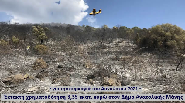 Με απόφαση του υπουργείου Εσωτερικών ο Δήμος Ανατολικής Μάνης χρηματοδοτείται με τον ποσό των 3.350.000 ευρώ για την πρόληψη και την αντιμετώπιση των ζημιών και των καταστροφών που προκλήθηκαν από την πυρκαγιά που έπληξε την περιοχή τον Αύγουστο 2021.