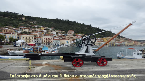 Το μεσημέρι της Πέμπτης 23 Δεκεμβρίου 2021 επανατοποθετήθηκε σε άριστη πλέον κατάσταση στην είσοδο του Λιμένα Γυθείου ο ιστορικός τροχήλατος γερανός (βίντζι), οποίος είχε αποσυρθεί με ευθύνη του Δημοτικού Λιμενικού Ταμείου Ανατολικής Μάνης προκειμένου να επισκευαστεί και να συντηρηθεί.