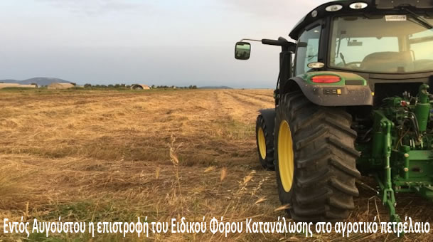 Επισπεύδεται, για τις αρχές Αυγούστου 2022, η επιστροφή στους κατά κύριο επάγγελμα αγρότες, του Ειδικού Φόρου Κατανάλωσης για το πετρέλαιο το οποίο κατανάλωσαν το πρώτο εξάμηνο του 2022 για τις καλλιέργειές τους.