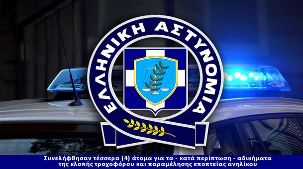 Συνελήφθησαν τέσσερα (4) άτομα για τα - κατά περίπτωση - αδικήματα της κλοπής τροχοφόρου και παραμέλησης εποπτείας ανηλίκου