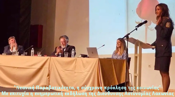 Με επιτυχία πραγματοποιήθηκε η ενημερωτική εκδήλωση της Διεύθυνσης Αστυνομίας Λακωνίας, με θέμα «Νεανική Παραβατικότητα, η σύγχρονη πρόκληση της κοινωνίας»
