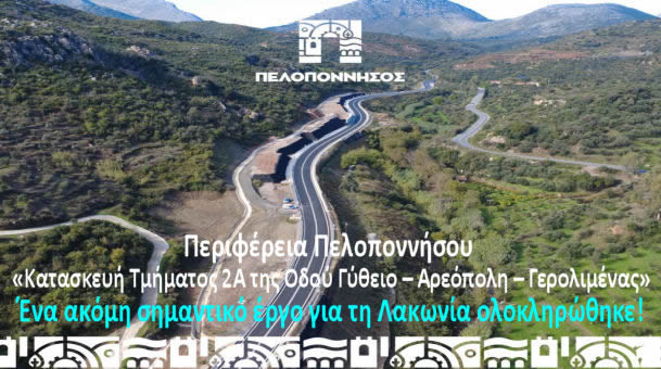 Με την ολοκλήρωση του έργου «Κατασκευή Τμήματος 2Α της Οδού Γύθειο - Αρεόπολη - Γερολιμένας», η Περιφέρεια Πελοποννήσου κάνει ακόμη ένα βήμα στην κατεύθυνση της ενίσχυσης της οδικής ασφάλειας, της συνδεσιμότητας και της αναπτυξιακής προοπτικής της Λακωνίας.