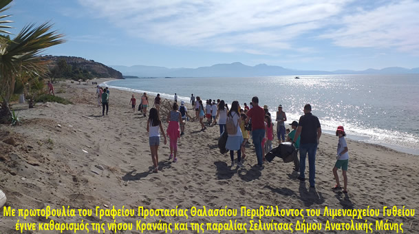 Με πρωτοβουλία του Γραφείου Προστασίας Θαλασσίου Περιβάλλοντος του Λιμεναρχείου Γυθείου έγινε καθαρισμός της νήσου Κρανάης και της παραλίας Σελινίτσας Δήμου Ανατολικής Μάνης