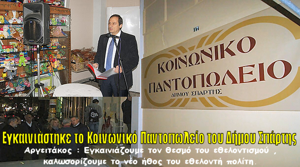 Ο Δήμος Σπάρτης εγκαινίασε το "Κοινωνικό Παντοπωλείο" του Δήμου την Παρασκευή 21 Δεκεμβρίου 2012 στο χώρο του Κοινωνικού Παντοπωλείου, στην οδό Βρασίδου 131 στη Σπάρτη.