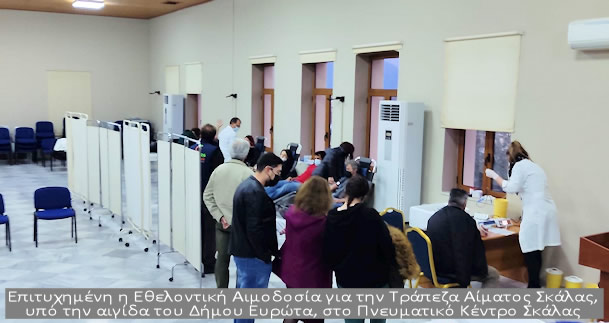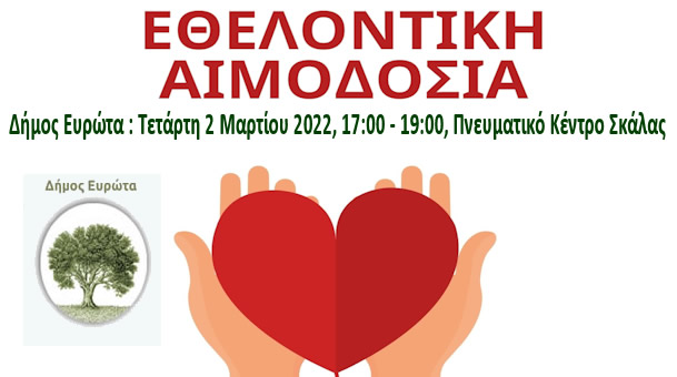 Ο Δήμος Ευρώτα, στο πλαίσιο της κοινωνικής ευαισθησίας και προσφοράς προς τον συνάνθρωπο, διοργανώνει εθελοντική αιμοδοσία την Τετάρτη 2 Μαρτίου 2022.