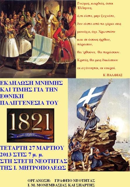 Εκδήλωση μνήμης και τιμής για την Εθνική Παλιγγενεσία του 1821 από το Γραφείο Νεότητας της Ιεράς Μητροπόλεως Μονεμβασίας & Σπάρτης την Τετάρτη 27 Μαρτίου 2013 στη Στέγη Νεότητας της Ιεράς Μητροπόλεως.