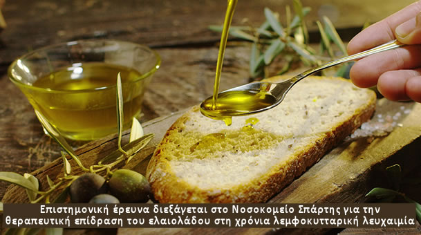 Με ιδιαίτερη χαρά πληροφορηθήκαμε ότι στο Νοσοκομείο Σπάρτης και υπό την ευθύνη του τμήματος Νοσηλευτικής του Πανεπιστημίου Πελοποννήσου, του Χαροκόπειου Πανεπιστημίου και του τμήματος Φαρμακευτικής του Εθνικού και Καποδιστριακού Πανεπιστημίου Αθηνών, πραγματοποιείται μία πολύ σημαντική έρευνα, σχετικά με την θεραπευτική επίδραση του ελαιολάδου στη χρόνια λεμφοκυτταρική λευχαιμία.