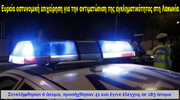 Στο πλαίσιο αντιμετώπισης της εγκληματικότητας, πραγματοποιήθηκε στις 28.11.2013 από το πρωί έως το μεσημέρι, ευρεία αστυνομική επιχείρηση στην ευρύτερη περιοχή της Λακωνίας, η οποία οργανώθηκε από την Αστυνομική Διεύθυνση Λακωνίας, σύμφωνα με τον γενικότερο επιχειρησιακό σχεδιασμό της Γενικής Αστυνομικής Διεύθυνσης Περιφέρειας Πελοποννήσου.