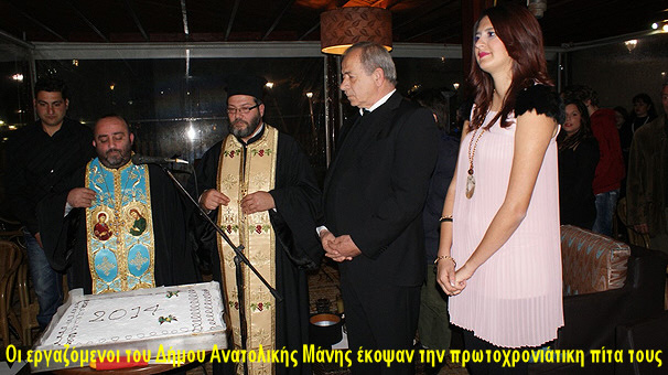Το Σάββατο 25 Ιανουαρίου 2014 οι εργαζόμενοι του Δήμου Ανατολικής Μάνης έκοψαν την πρωτοχρονιάτικη πίτα τους παρουσία του Δημάρχου Ανατολικής Μάνης Πέτρου Ανδρεάκου και μελών του Δημοτικού Συμβουλίου. Παρόντες επίσης πρόεδροι Δημοτικών και Τοπικών Κοινοτήτων.