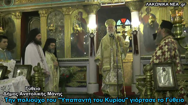Με ιδιαίτερη εκκλησιαστική λαμπρότητα γιόρτασε και φέτος την πολιούχο του "Υπαπαντή του Κυρίου" το Γύθειο, έδρα του Δήμου Ανατολικής Μάνης, την Κυριακή 2 Φεβρουαρίου 2014.