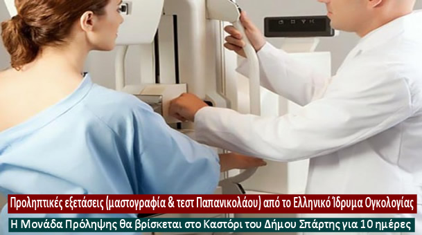 Ο Δήμος Σπάρτης σε συνεργασία με το Ελληνικό Ίδρυμα Ογκολογίας προβαίνουν σε προληπτικές εξετάσεις (μαστογραφία και τεστ Παπανικολάου) στο γυναικείο πληθυσμό.