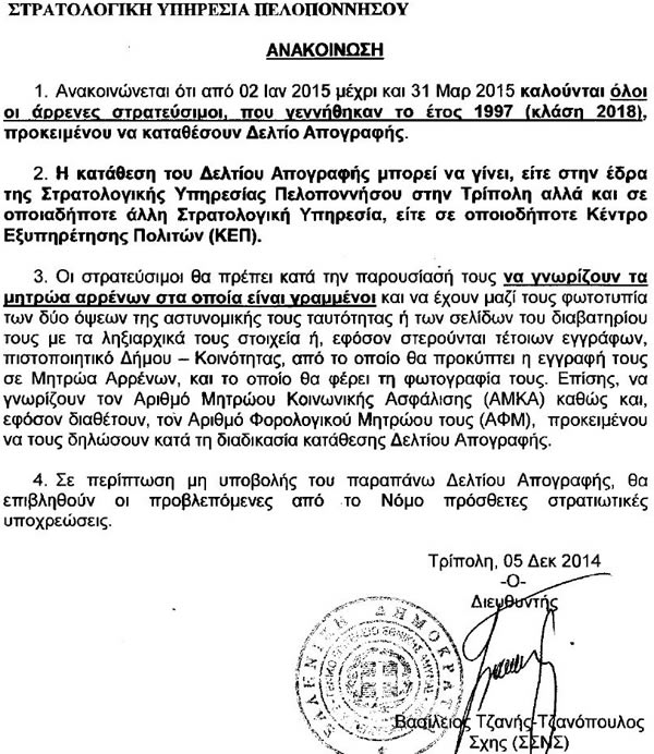 Στρατολογική Υπηρεσία Πελοποννήσου : Καλούνται οι στρατεύσιμοι κλάσης 2018 να καταθέσουν Δελτίο Απογραφής.