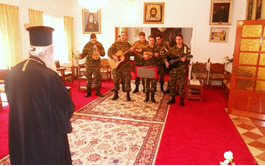 Η χορωδία του Κέντρου Εκπαίδευσης Εφοδιασμού Μεταφορών, για άλλη μια φορά, έδωσε ένα ξεχωριστό τόνο στην εορταστική ατμόσφαιρα με τα Πρωτοχρονιάτικα Κάλαντα και εορταστικά τραγούδια. Ο Σεπτός Ποιμενάρχης μας συνεχάρη τους στρατευμένους για τη παρουσία τους και τους ευχήθηκε η νέα χρονιά να είναι ευλογημένη για τους ίδιους και τις οικογένειές τους. Επίσης τους προέτρεψε κατά τη διάρκεια της θητείας τους να προσφέρουν ό,τι καλό μπορούν στη Πατρίδα και οι ίδιοι από τη πλευρά τους να αποκομίσουν όσο το δυνατόν περισσότερες εμπειρίες και γνώσεις, που θα τους είναι ωφέλιμες και στη πολιτική τους ζωή. Ακολούθησε μικρό κέρασμα.
