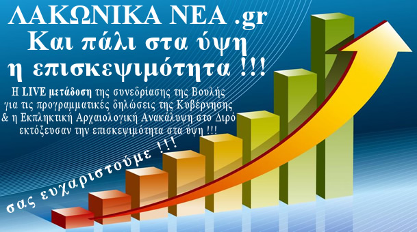 Η ΖΩΝΤΑΝΗ ΜΕΤΑΔΟΣΗ από τα ΛΑΚΩΝΙΚΑ ΝΕΑ .gr της συνεδρίασης της Βουλής για τις προγραμματικές δηλώσεις της Κυβέρνησης την Τρίτη 10/02/2015 και το θέμα που παρουσιάσαμε με την Εκπληκτική Αρχαιολογική Ανακάλυψη στο Διρό (ο τάφος με ζευγάρι από τους αρχαιότερους στον κόσμο !!!) εκτόξευσαν την επισκεψιμότητα στα ύψη για μια ακόμη φορά.