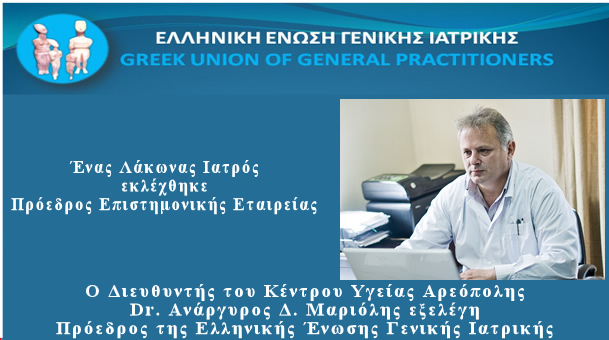 Αποτελεί μεγάλη τιμή για τη Λακωνία η διάκριση του σπουδαίου Ιατρού, Διευθυντή του Κέντρου Υγείας Αρεόπολης και Διδάκτωρα της Ιατρικής Σχολής Πανεπιστημίου Αθηνών κ. Ανάργυρου Μαριόλη, ο οποίος στις χθεσινές εκλογές της Ελληνικής Ένωσης Γενικής Ιατρικής κατέλαβε την πλειοψηφία των ψήφων και αναδείχθηκε πρόεδρος της «ΕΝΩΣΗΣ».