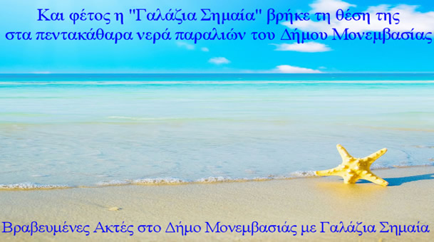 Ο Δήμος Μονεμβασίας και η Κοινωφελής Επιχείρηση Παιδείας και Περιβάλλοντος του Δήμου Μονεμβασίας ανακοινώνουν ότι για το έτος 2015 η Ελληνική Εταιρία Προστασίας της Φύσης βράβευσε με Γαλάζια Σημαία τις εξής ακτές του δήμου: