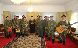 Οι στρατευμένοι ολοκληρώνοντας το πρόγραμμά τους ευχήθηκαν χρόνια πολλά στο Σεβασμιώτατο, ο οποίος με τη σειρά του τους συνεχάρη, τους έδωσε τις πατρικές του ευχές για ευλογημένα Χριστούγεννα, καλή χρονιά και καλό υπόλοιπο θητείας, ενώ ακολούθησε μικρό κέρασμα. Νωρίτερα η χορωδία του ΚΕΕΜ είχε επισκεφθεί το Ίδρυμα Περιθάλψεως Χρονίως Πασχόντων ‘’ο Άγιος Παντελεήμων’’ δίνοντας χαρά σε τροφίμους και εργαζόμενους.