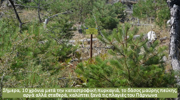 Σήμερα, 10 χρόνια μετά την καταστροφική πυρκαγιά, το δάσος μαύρης πεύκης, αργά αλλά σταθερά, καλύπτει ξανά τις πλαγιές του Πάρνωνα. Οι μαυρισμένες από την πυρκαγιά πλαγιές απέναντι από το Πολύδροσο (Τζίτζινα) αποκτούν και πάλι το πράσινο των μαυρόπευκων και των ελάτων, κάνοντας απτά τα αποτελέσματα της συλλογικής προσπάθειας, εκπέμποντας ισχυρό το μήνυμα για τις δυνατότητες που παρέχουν ο ρεαλιστικός και επιστημονικά στέρεος σχεδιασμός και η συνεργασία με τις τοπικές κοινωνίες.