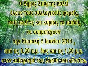 Με σκοπό λοιπόν να δώσουμε, αυτήν την συμβολική μέρα τα μήνυμα της σωτηρίας του πλανήτη, αλλά και τα μηνύματα του εθελοντισμού και της συμμετοχής, ο Δήμος Σπάρτης καλεί όλους τους συλλογικούς φορείς, τους πολίτες και κυρίως τα παιδιά,, να συμμετέχουν την Κυριακή 5 Ιουνίου, από τις 9.30 π.μ. έως και τις 1.30 μ.μ. στην εκστρατεία καθαρισμού του λόφου του «Ξενία».