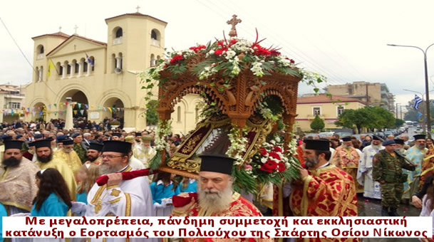 Με την πρέπουσα μεγαλοπρέπεια, πάνδημη συμμετοχή και εκκλησιαστική κατάνυξη η Σπάρτη και η ευρύτερη περιοχή εόρτασαν και φέτος τη μνήμη του Οσίου πατρός ημών Νίκωνος του ”Μετανοείτε”, Πολιούχου αυτής.