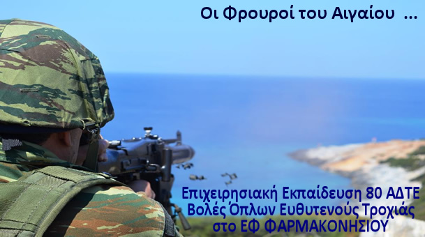 Στο πλαίσιο της επιχειρησιακής εκπαίδευσης της 80 ΑΔΤΕ, πραγματοποιήθηκε στο ΦΑΡΜΑΚΟΝΗΣΙ, την Τετάρτη 26 Απριλίου 2017, βολή όπλων ευθυτενούς τροχιάς σε θαλάσσιους στόχους, από Εθνοφύλακες του Τάγματος Εθνοφυλακής ΚΩ και προσωπικό του Επιτηρητικού Φυλακίου ΦΑΡΜΑΚΟΝΗΣΙΟΥ