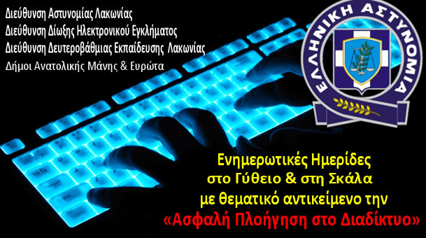 Από τη Διεύθυνση Αστυνομίας Λακωνίας, σε συνεργασία με τη Διεύθυνση Δίωξης Ηλεκτρονικού Εγκλήματος, την Διεύθυνση Δευτεροβάθμιας Εκπαίδευσης Ν. Λακωνίας και τους Δήμους Ανατολικής Μάνης και Ευρώτα, μετά από σχετικό ενδιαφέρον της τοπικής κοινωνίας και με πρωτοβουλία του Αναπληρωτή Γενικού Γραμματέα του Υπουργείου Εσωτερικών κ. Τζανέτου Φιλιππάκου, θα διοργανωθούν ενημερωτικές ημερίδες με θεματικό αντικείμενο την «Ασφαλή Πλοήγηση στο Διαδίκτυο».