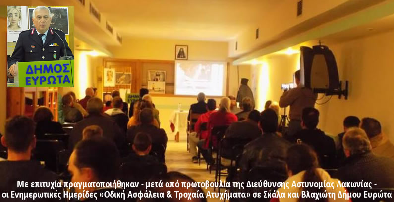 Με επιτυχία πραγματοποιήθηκαν, μετά από πρωτοβουλία της Διεύθυνσης Αστυνομίας Λακωνίας, οι Ενημερωτικές Ημερίδες «Οδική Ασφάλεια και Τροχαία Ατυχήματα» σε Σκάλα και Βλαχιώτη Δήμου Ευρώτα