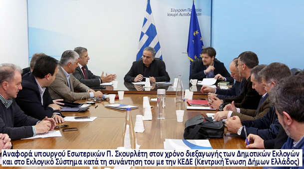 Αναφορά του Υπουργού Εσωτερικών Π. Σκουρλέτη στον χρόνο διεξαγωγής των Δημοτικών Εκλογών και στο Εκλογικό Σύστημα κατά τη συνάντηση του με την ΚΕΔΕ (Κεντρική Ένωση Δήμων Ελλάδος)