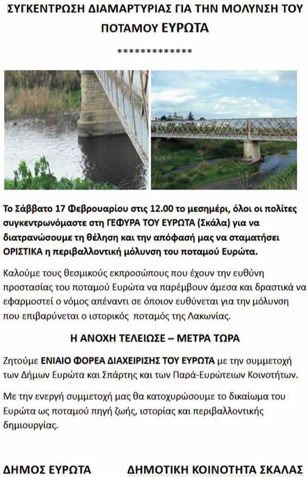 Συγκέντρωση διαμαρτυρίας για τη μόλυνση του ποταμού Ευρώτα θα γίνει το Σάββατο 17/2/2018 και ώρα 12:00 το μεσημέρι στη γέφυρα του Ευρώτα στη Σκάλα.