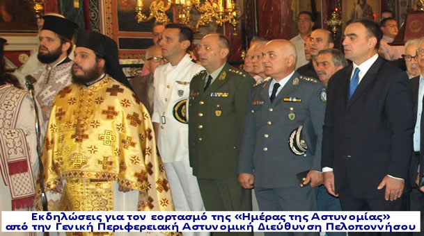 Εκδηλώσεις για τον εορτασμό της «Ημέρας της Αστυνομίας» και του Προστάτη του Σώματος «Μεγαλομάρτυρα Αγίου Αρτεμίου» πραγματοποιήθηκαν στις 20.10.2019 στη Γενική Περιφερειακή Αστυνομική Διεύθυνση Πελοποννήσου, καθώς η 20η Οκτωβρίου, έχει θεσπιστεί από την Πολιτεία, ως ημέρα για την αναγνώριση του έργου και της προσφοράς της Ελληνικής Αστυνομίας στο κοινωνικό σύνολο.